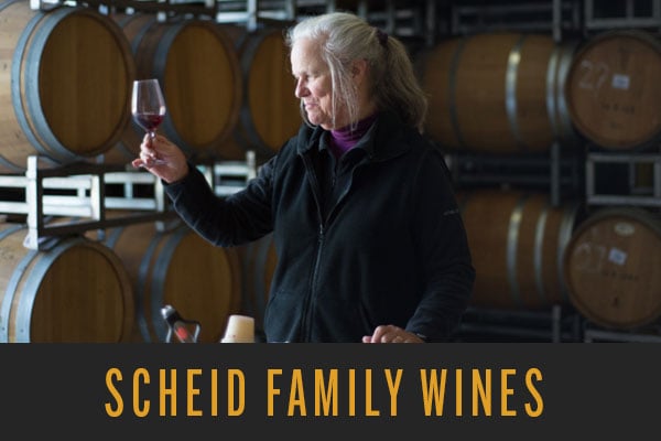 "100% Premium Estate Grown Grapes" fra Scheid Vineyards. Og vi prisdumper hele sortimentet lige fra den fadlagrede Chardonnay til den komplekse Pinot Noir.